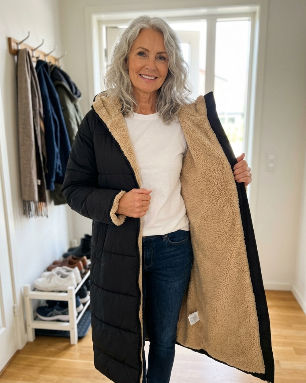 The reversible winter coat that gives you two looks in one. Black quilted side for sleek everyday style, beige sherpa side for extra cozy warmth. Both sides lined with soft fleece to keep you comfortable all winter. The long length provides full coverage while the relaxed fit skims your body without adding bulk. Flip it inside out and instantly change your look. One coat, endless styling options.